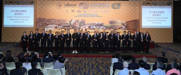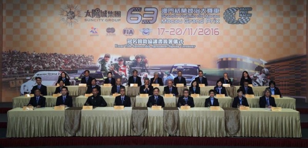 A 63ª edição do evento desportivo anual em Macau, o Grande Prémio de Macau, terá lugar de 17 a 20 de Novembro de 2016. A Comissão Organizadora do Grande Prémio de Macau teve a cerimónia da assinatura do acordo hoje (dia 18 de Julho) no Centro de Convenções e Entretenimento da Torre de Macau, com a presença do Doutor Alexis Tam Chon Weng, Secretário para os Assuntos Sociais e Cultura do Governo da Região Administrativa Especial de Macau e Presidente da Comissão Organizadora do Grande Prémio de Macau, testemunhou a assinatura do acordo do Título de Patrocínio entre Instituto do Desporto do Governo da RAEM e Suncity Grupo.
