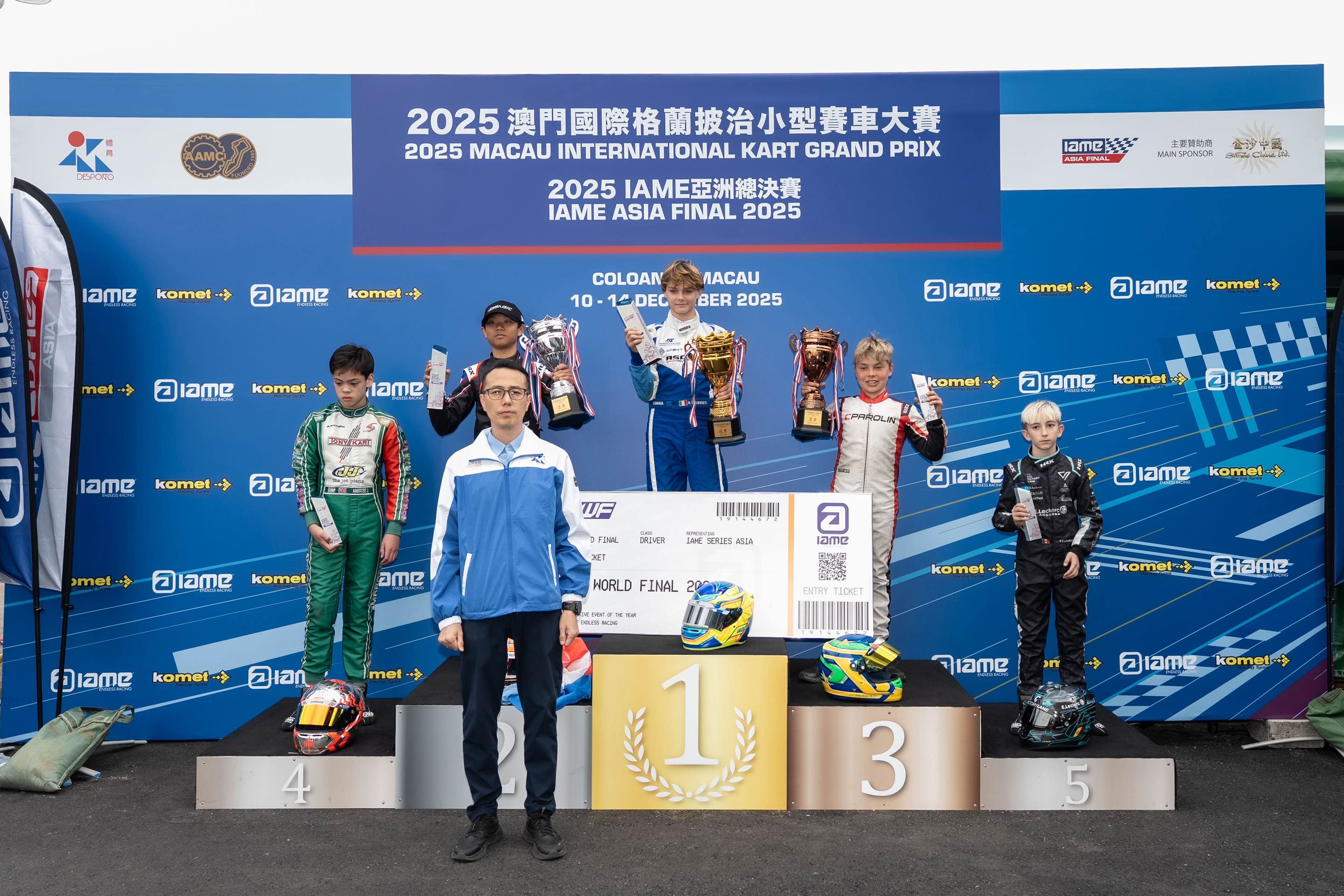 賽事結束後進行頒獎儀式,頒獎嘉賓包括體育局代局長李詩靈、中國-澳門汽車總會會員大會主席鍾國榮、IAME市場總監Marco Moretti、中國-澳門汽車總會理事長何比道、體育局澳門格蘭披治大賽車及大型體育活動廳廳長黃家權。