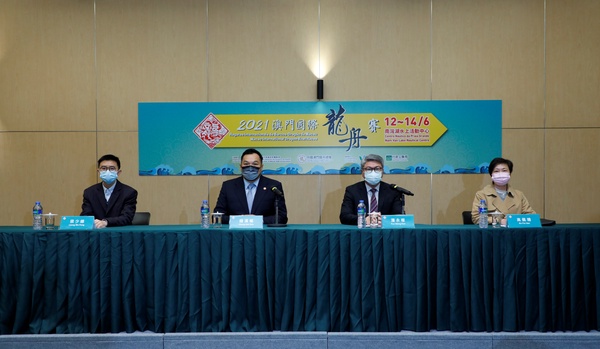 由體育局及中國澳門龍舟總會主辦,市政署及行政公職局協辦的“2021澳門國際龍舟賽”活動,將於本年6月12日至14日一連三天在南灣湖水上活動中心舉行。賽事組委會今日(23日)舉行新聞發佈會,介紹活動詳情。出席新聞發佈會的嘉賓包括體育局局長潘永權、中國澳門龍舟總會理事長鍾漢權、市政署文康及公民教育廳廳長高佩珊、行政公職局公職福利處處長梁少峰、體育局副局長劉楚遠及林蓮嬌。