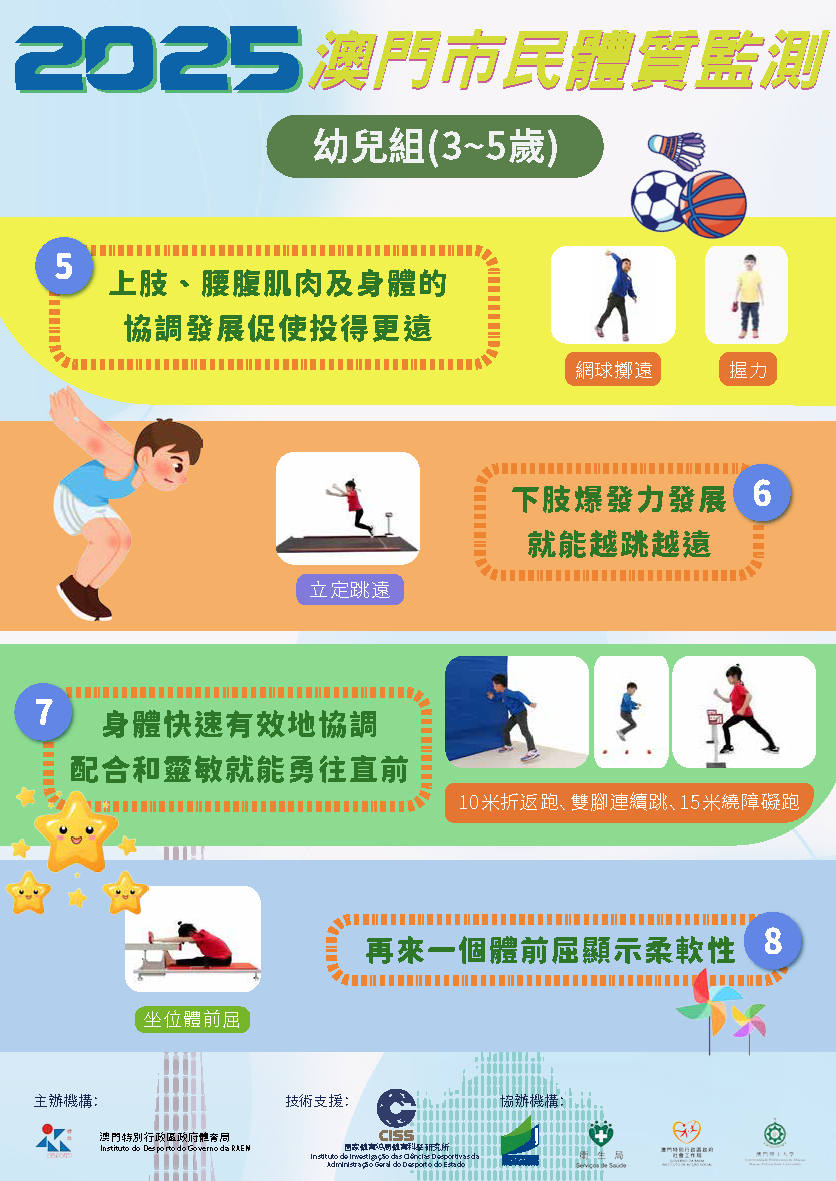2025年澳門市民體質監測中幼兒組是指就讀澳門幼兒教育階段之本地3-5歲幼兒。幼兒期正處於身體形態和機能發育、發展的重要時期,是形成良好體質的基礎階段。因此,通過對幼兒的體質狀况給予科學嚴謹的監測與評價,能更好地瞭解幼兒生長發育狀况,爲幼兒的健康成長、體育鍛煉提供有效依據。