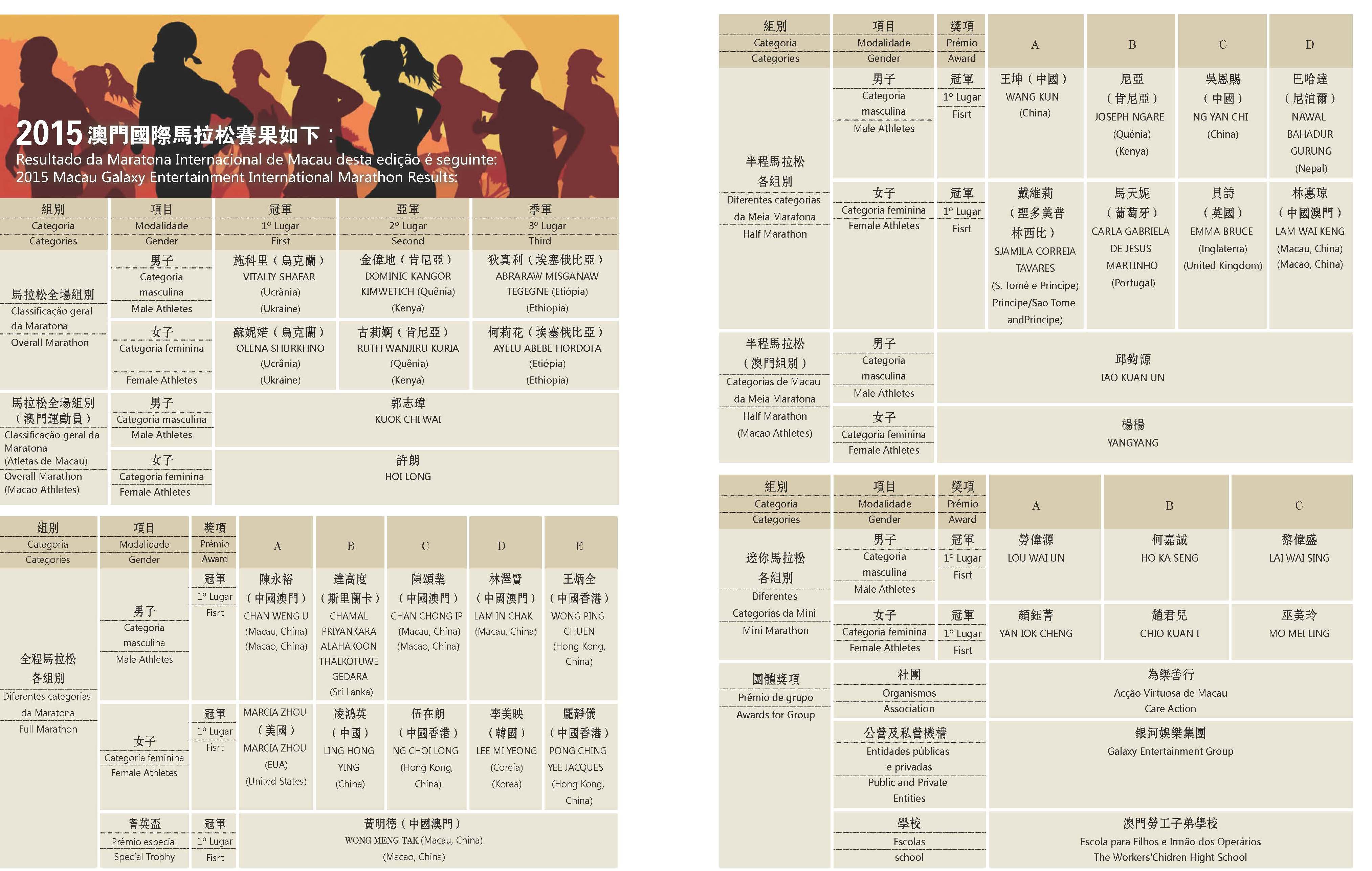 Na prova de 4,2 km da Mini Maratona, na categoria B, Ho Ka Seng nos masculinos, chegou primeiro à meta com o tempo de 00:14:09, e na categoria B, Chio Kuan I, nos femininos, com o tempo de 0:18:16.