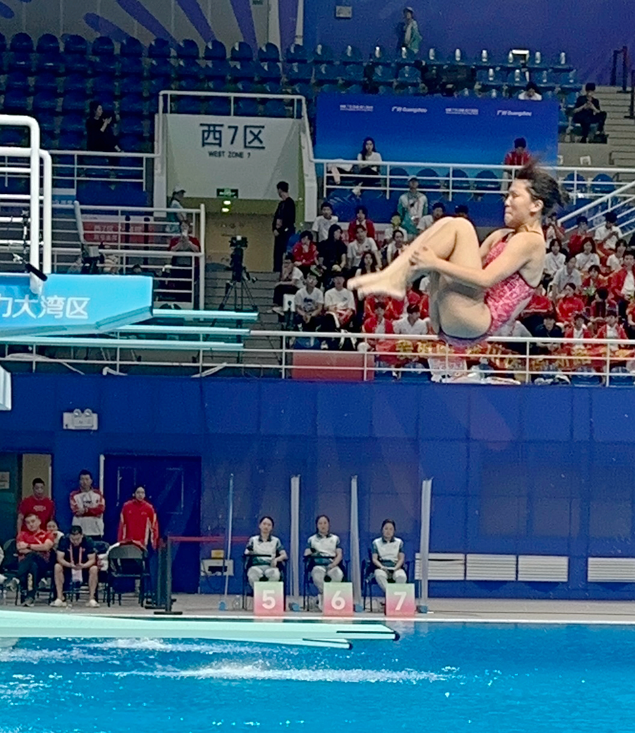 昨(5)日進行的跳水女子1米跳板比賽,趙婞愉 (ZHAO HANG U)及梁欣宜(LEONG IAN I)均完成5跳動作,分別獲得182.9分和109.3分,位列第20名和第21名。