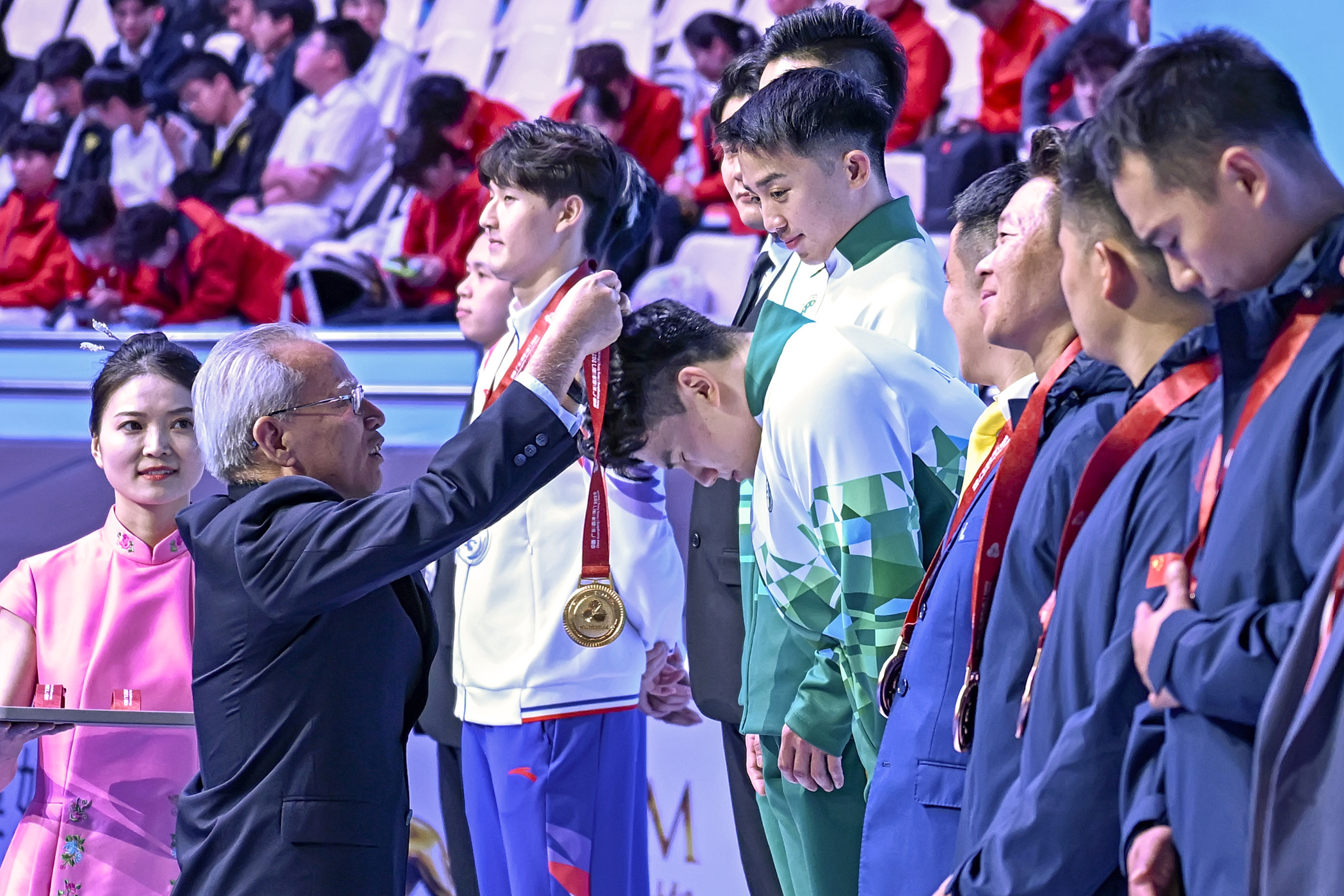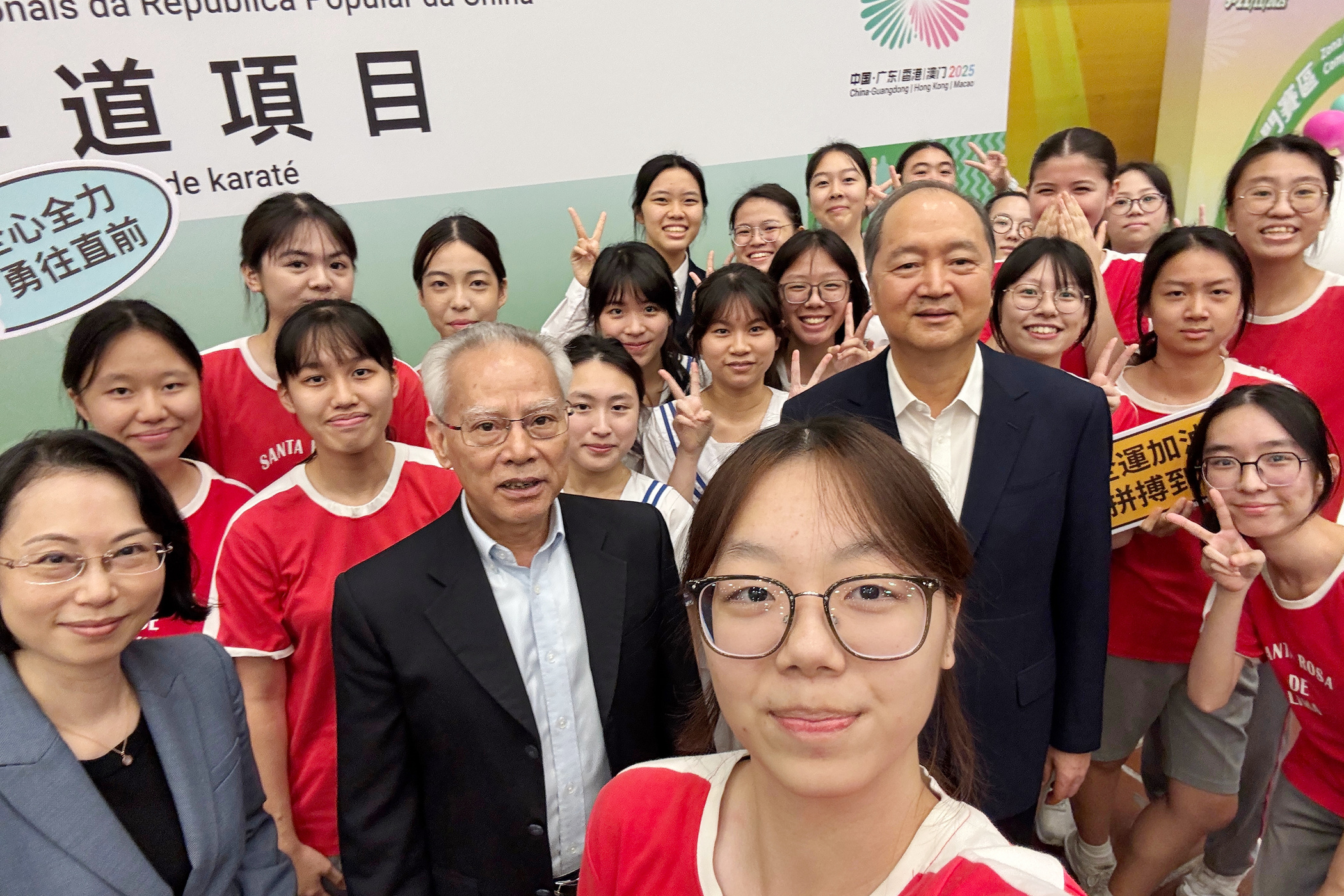 『第十五屆全國運動會』今(6)日在澳門賽區進行空手道項目,坐擁主場優勢的澳門隊首日比賽即傳來喜訊,郭建恆(KUOK KIN HANG)繼2021年西安全運會勇奪個人型銅牌,為澳門奪得歷史性獎牌後,今屆夥拍隊友鄭沘珞(CHEANG PEI LOK)及方文浩(FONG MAN HOU)在男子組團體型再造出好成績,決賽以42.7分擊敗香港隊摘金,為澳門參加全運會以來首面金牌。澳門特別行政區行政長官岑浩輝出席頒獎禮,親自為澳門運動員頒發獎牌。