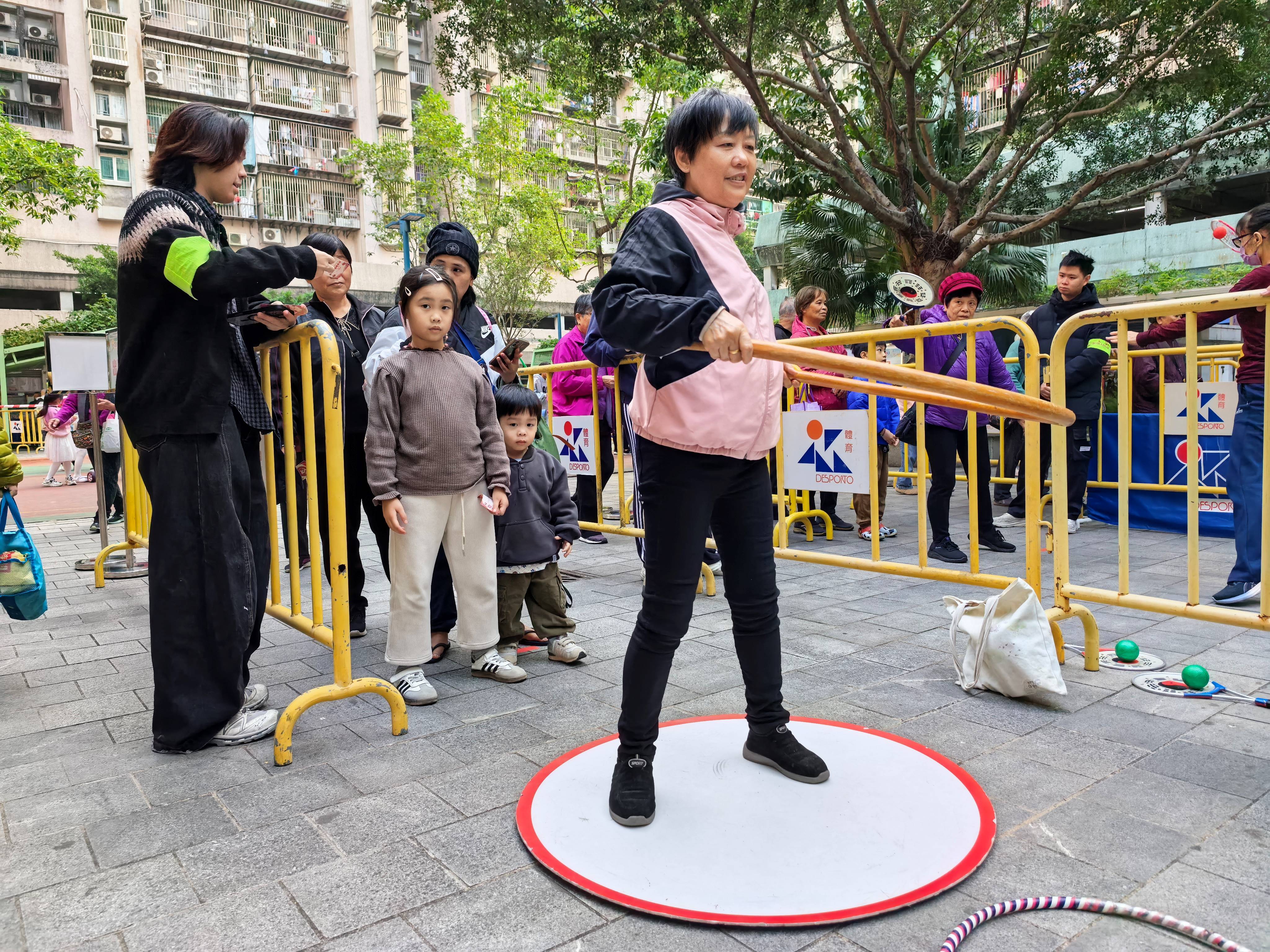 由體育局主辦的“大眾康體日”活動,於12月27日在宏開宏建休憩區舉行,活動吸引了眾多市民到場參與,當中有不少家長帶同子女前來參與,藉著參與康體活動增進親子關係,同時寓運動於娛樂。場內氣氛溫馨熱鬧,樂也融融。