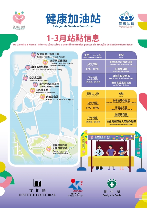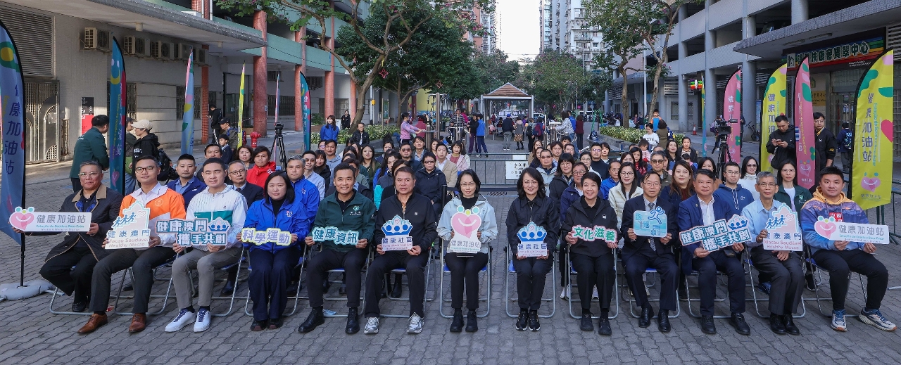 隨後,一眾嘉賓前往現場設立的“健康加油站”,了解運作情況並與居民互動交流,氣氛熱烈。“健康加油站”首階段活動於1月12日至3月31日期間,逢星期一至五(政府假日、惡劣天氣及維護期間除外)上午8:00至10:00及下午16:30至18:30,於紀念孫中山市政公園、白鴿巢公園、綠楊花園休憩區、華士古達嘉馬花園、永寧廣場休憩區、宋玉生公園、加思欄花園及氹仔奧林匹克大馬路休憩區共八個站點同步開展,敬請留意開放時間。各站配有“健康加油站”橫額,工作人員亦會佩戴相關胸針,以便居民識別。文化局、體育局及衛生局將分別派出“文化傳播員”、“健身指導員”及“健康促進員”,為居民提供文化活動指導與資訊、個性化科學運動指導、免費血壓測量、健康資訊與評估,並協助預約衛生中心醫療服務,包括疾病篩查、疫苗接種、心理評估等多項內容。