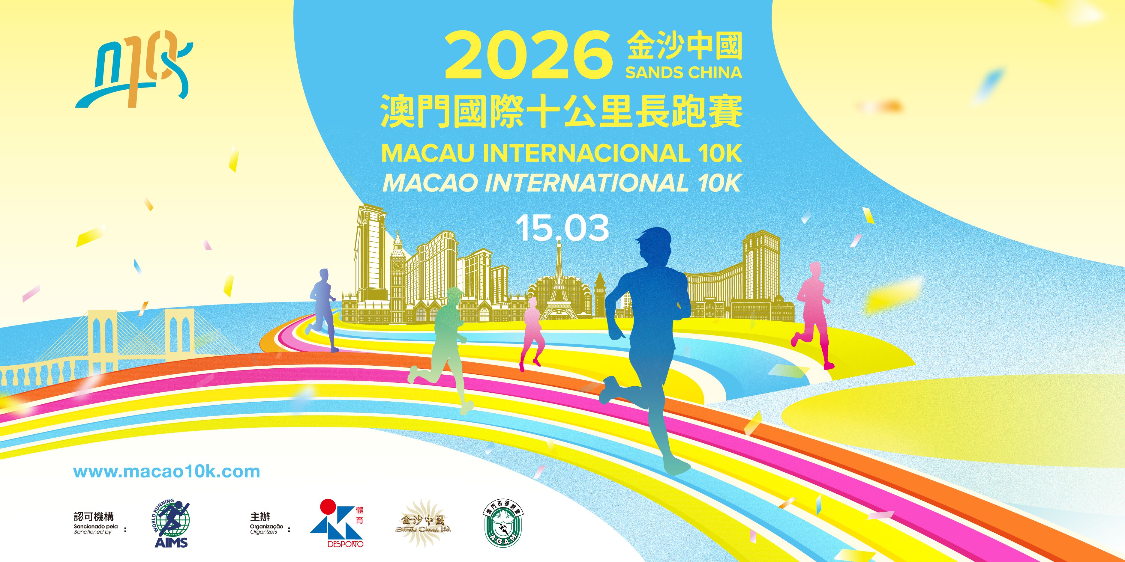 「2026金沙中國澳門國際十公里長跑賽」吸引來自38個國家及地區的跑手參與,十公里賽將率先於比賽當日早上7時鳴槍,歡樂跑則於7時40分起跑,起跑地點均為西灣湖廣場。十公里比賽路線將途經西灣大橋及金光大道,終點為奧林匹克體育中心運動場。歡樂跑起跑後,將途經西灣大橋,並於奧林匹克體育中心運動場衝線。賽事組委會邀請到多名來自內地、肯尼亞、埃塞俄比亞、摩洛哥、巴林和中國香港的運動員進行競逐,當中包括上屆賽事女子冠軍的肯尼亞選手謝賓諾(Cintia Chepngeno),而代表本澳參賽的黃展華和許朗亦將與一眾好手共同努力爭取佳績。