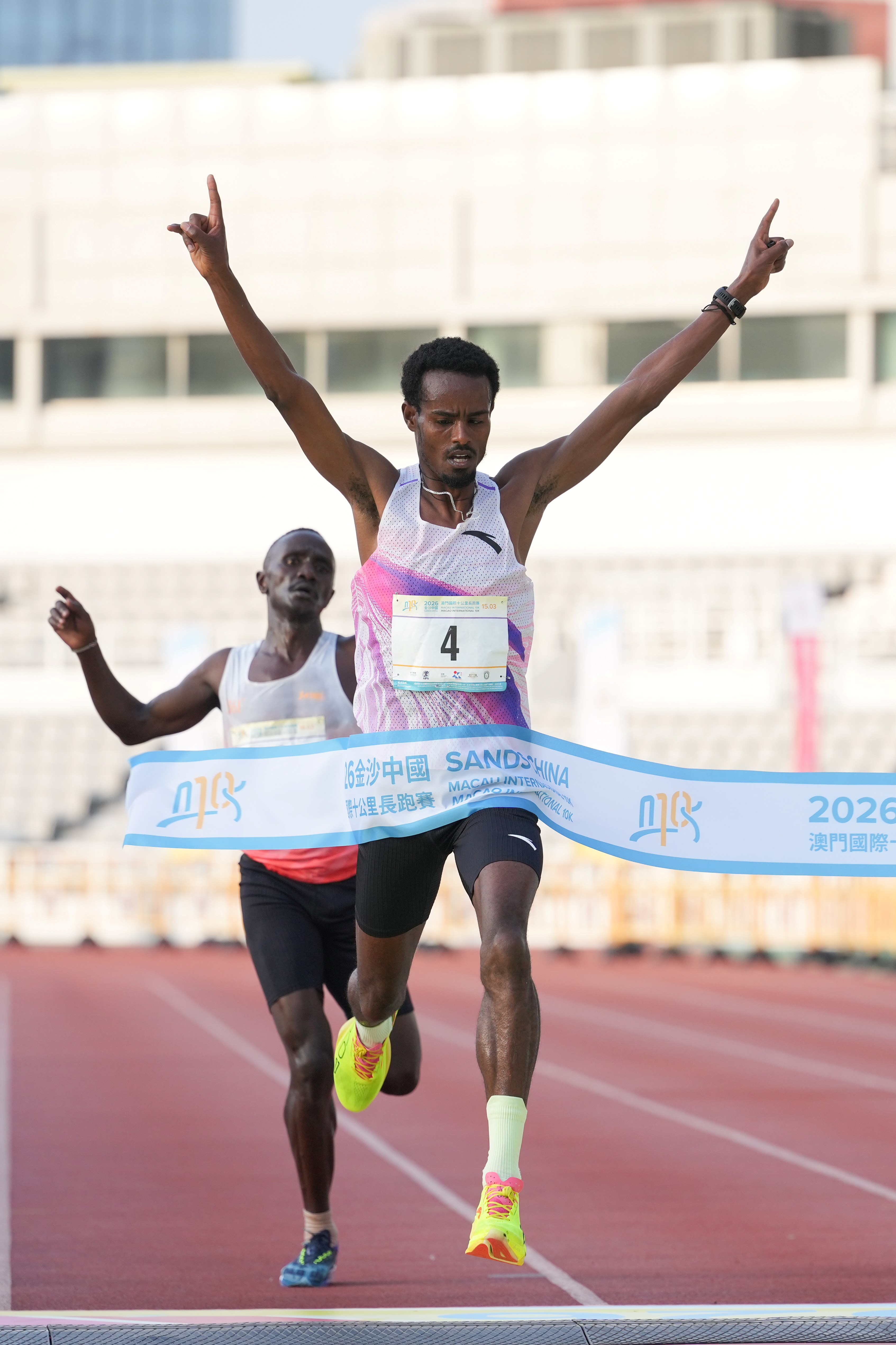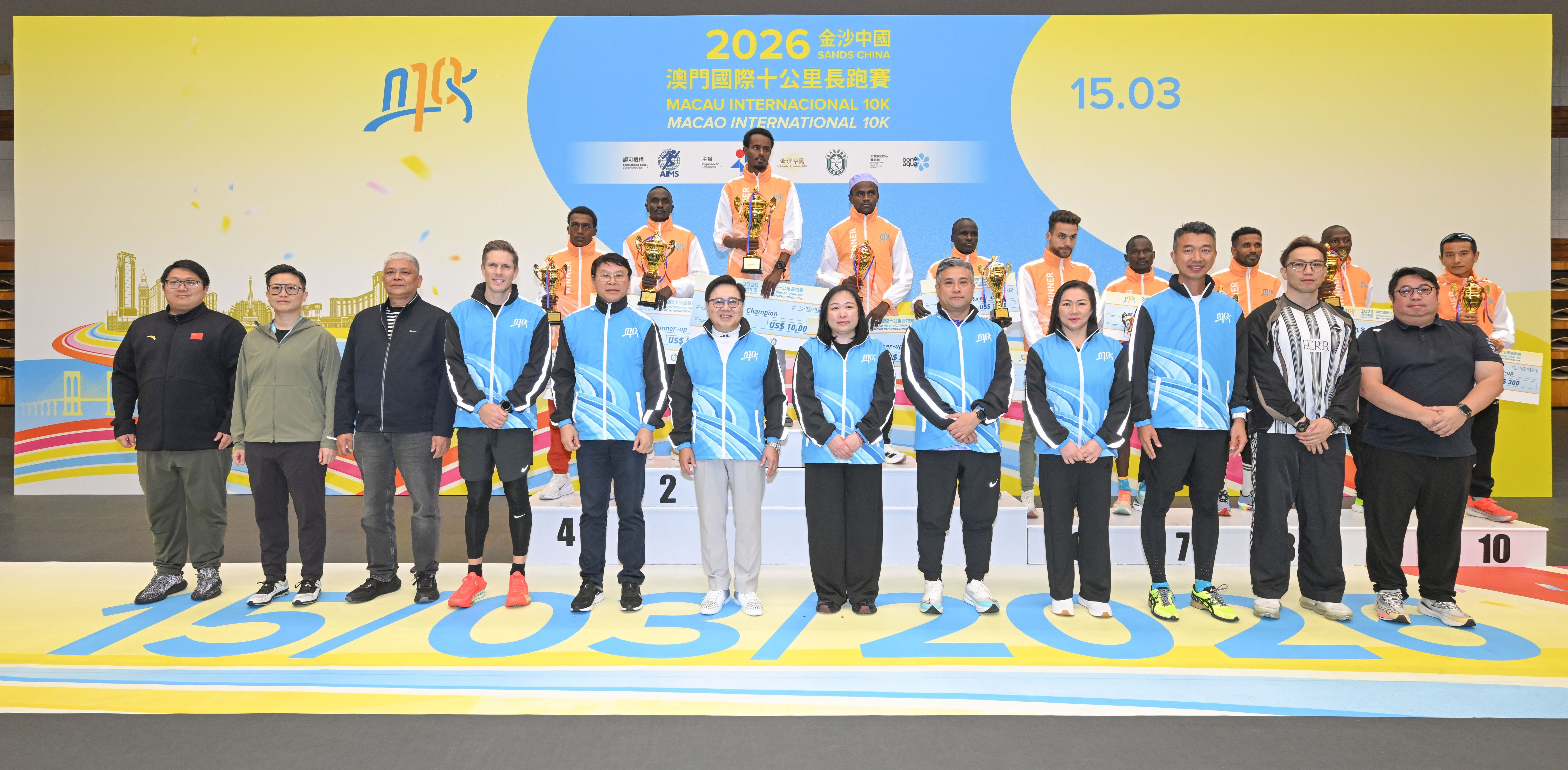 由體育局、金沙中國有限公司及澳門田徑總會舉辦的「2026金沙中國澳門國際十公里長跑賽」今(15)日舉行,十公里賽率先在上午7時進行,而歡樂跑則在上午7時40分起跑。經一輪角逐後,十公里賽男、女子全場總冠軍分別由來自埃塞俄比亞的艾斯發(Aklilu Gebremariam Asfaw)及肯尼亞的莫煒(Fridah Ndinda Mweu)奪得。