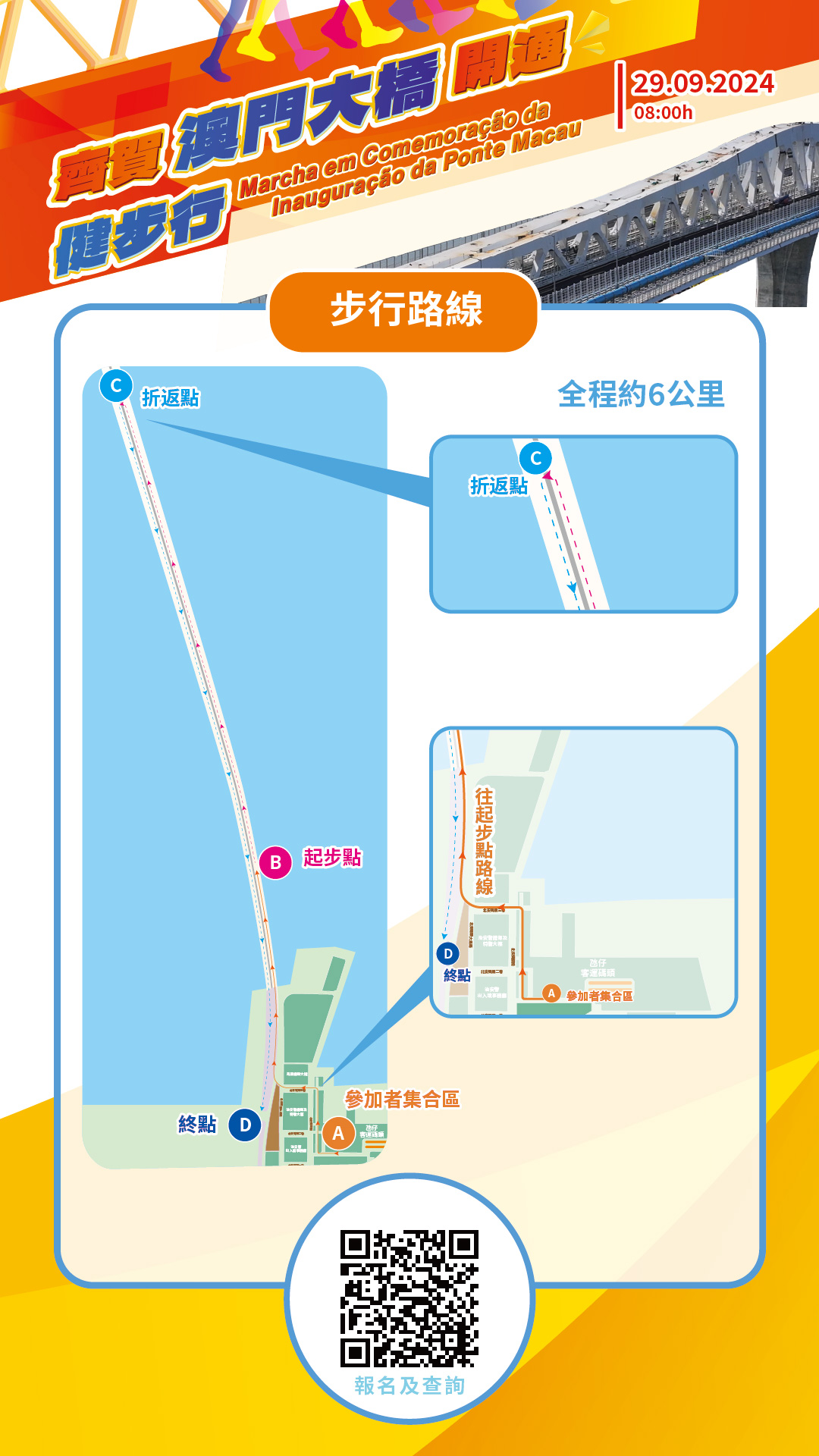 “齊賀澳門大橋開通健步行”活動將於9月29日上午8時舉行,參加者將由澳門大橋連接氹仔北安引橋處出發,行至澳門大橋接近A區引橋的位置再折返至氹仔北安起點,以步行方式走過大橋,全長約6公里。為確保活動有序進行,健步行將分成兩個時段出發,敬請參加者留意以下時間:
