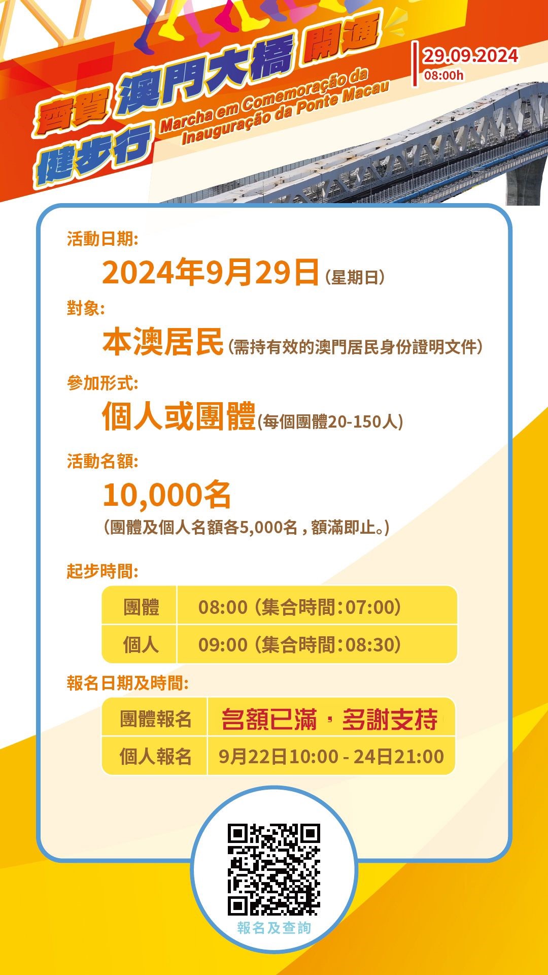由體育局主辦的“齊賀澳門大橋開通健步行”團體報名於今(19)日開始接受報名,報名情況踴躍,截至今日下午5時,團體名額已經額滿。個人報名將於9月22日(週日)上午10時開始,持有澳門居民身份證人士可登入活動報名網站pontemacau_walkreg.sport.gov.mo、體育局網頁活動日誌或掃描網上報名二維進行報名程序,名額5,000, 額滿即止。