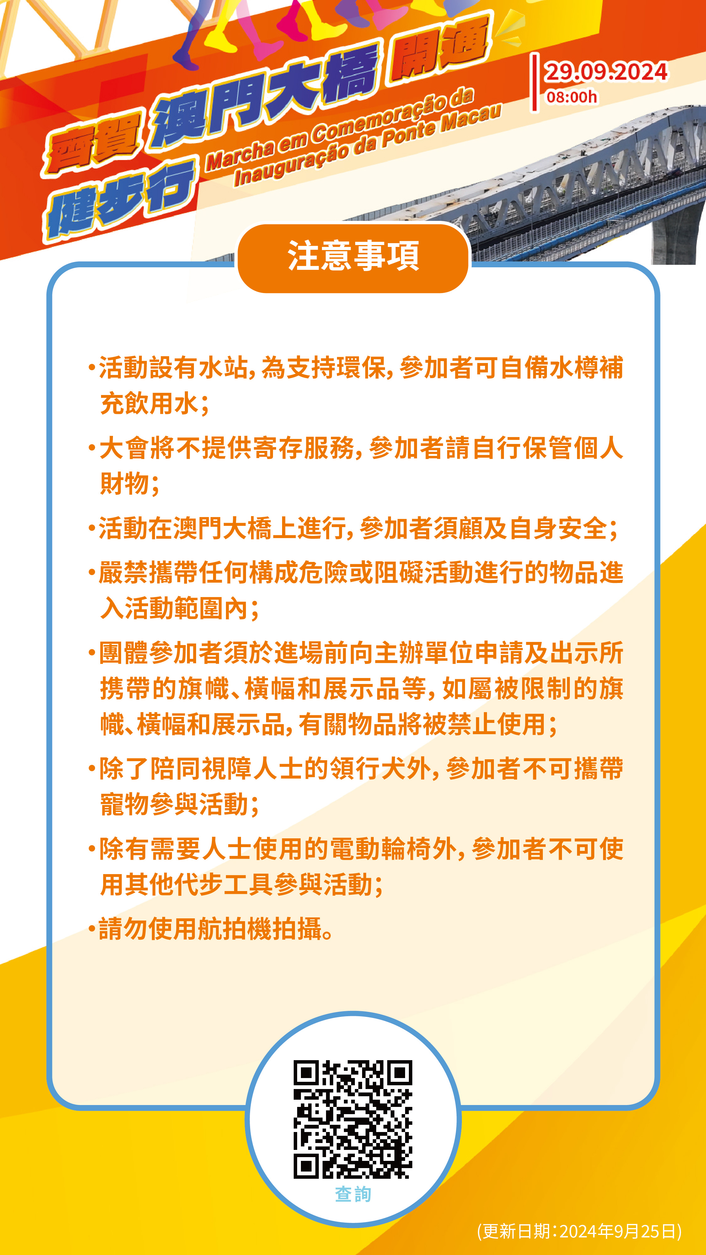 “齊賀澳門大橋開通健步行” 全程約6公里,中途不設離場通道,主辦單位提醒參加者在出發前應自行評估體力狀況。由於活動在澳門大橋上進行,參加者須顧及自身安全;嚴禁攜帶任何構成危險或阻礙活動進行的物品進入活動範圍內;請勿使用航拍機拍攝。現場不提供寄存服務,參加者請自行保管個人財物;團體參加者須於進場前向主辦單位申請及出示所携帶的旗幟、橫幅和展示品等,如屬被限制的旗幟、橫幅和展示品,有關物品將被禁示使用;除了陪同視障人士的領行犬外,參加者不可攜帶寵物參與活動;除有需要人士使用的電動輪椅外,參加者不可使用其他代步工具參與活動。此外,如需帶備雨具,主辦單位呼籲參加者自備輕便雨衣。活動當日現場設有水站,為支持環保,參加者可自備水樽補充飲用水,細則請查閱活動章程。