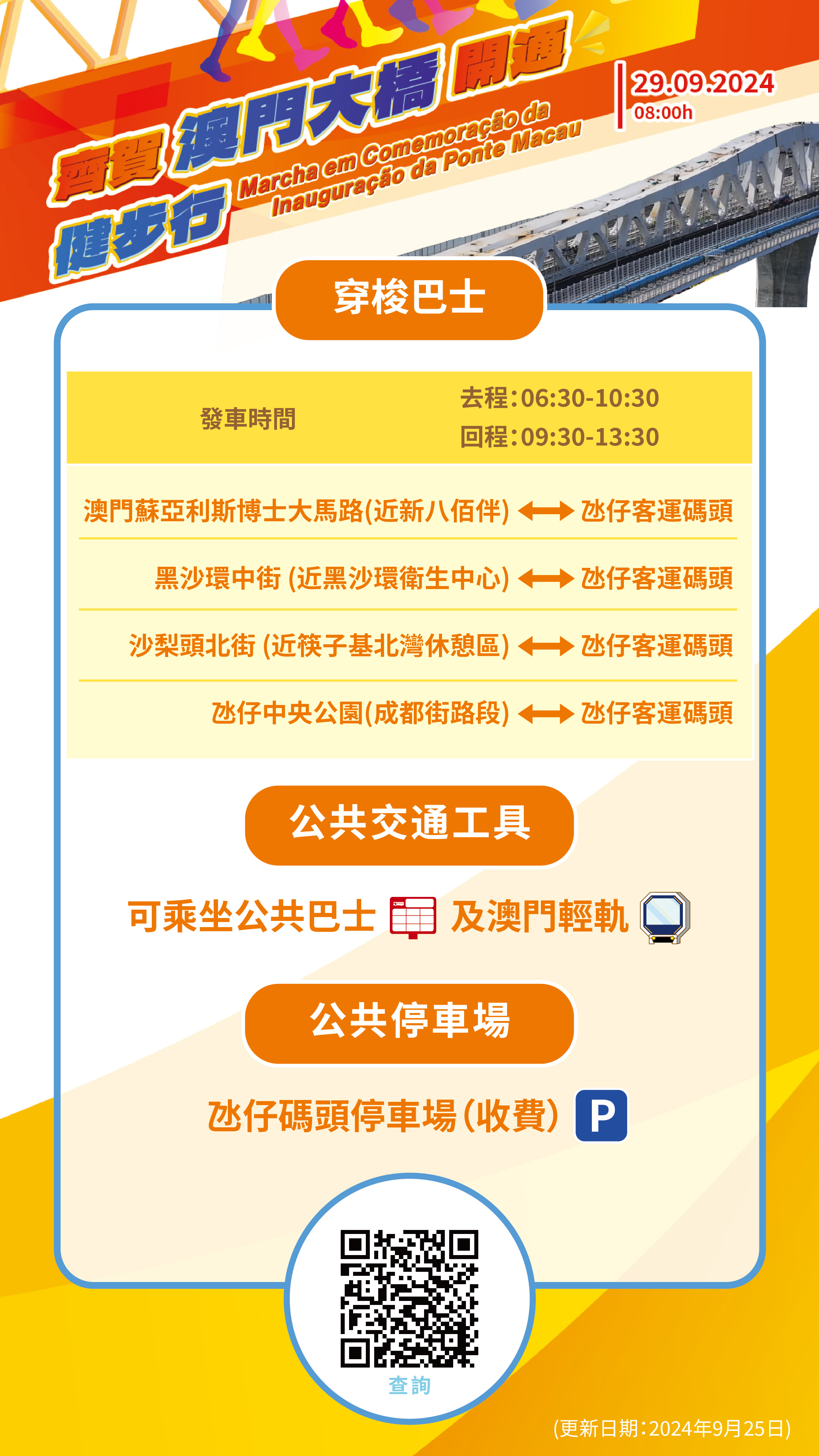 主辦單位呼籲參加者於活動當日(9月29日)盡量使用公共交通或穿梭巴士服務。穿梭巴士將於澳門半島及氹仔市區共設置4個乘車點,包括澳門蘇亞利斯博士大馬路(近新八佰伴)、黑沙環中街(近黑沙環衛生中心)、沙梨頭北街(近筷子基北灣休憩區)及氹仔中央公園(成都街路段),去程乘車時間為上午 6時30分至10時30分,回程乘車時間為上午9時30分至下午1時30分。此外,參加者可乘坐公共巴士到達氹仔客運碼頭及北安出入境事務大樓等站點,或乘搭澳門輕軌到達活動現場附近 ,經與澳門輕軌股份有限公司協調,在活動舉行前後期間,輕軌亦會加密班次,同時,亦會視乎情況,在必要時增加車廂疏導乘客。駕車人士可將車輛停泊於氹仔客運碼頭停車場內,車位數量有限,先到先得。參加活動的團體,如使用旅遊巴士(22座或以上)接載參加者到活動現場,則可使用旅遊巴士臨時上落客區。